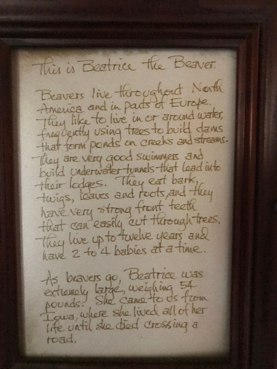 Beatrice the Beaver, mascot of Cabin Beaver, where my hiking friends and I landed for a much needed zero day. Her story is offered below: