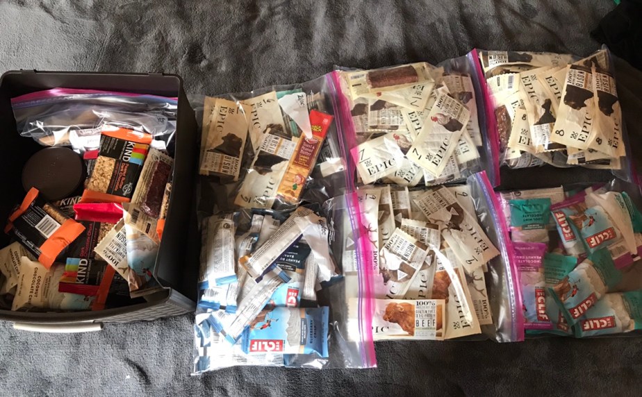 This morning I pulled all of my maildrop bags out the boxes so that we could organize the Epic and Clif bars by expiration date. My kid agreed to go on a backpacking trip with me–the first ever–and there will be many day hikes. We will have plenty of snacks.
